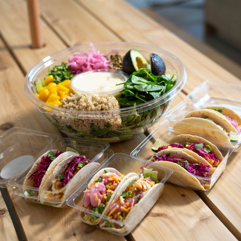 Pour 8 personnes et plus, nos boîtes à lunch comprennent 2 tacos+ une salade, ou un bol signature, un dessert santé, une mini collation et ustensiles.